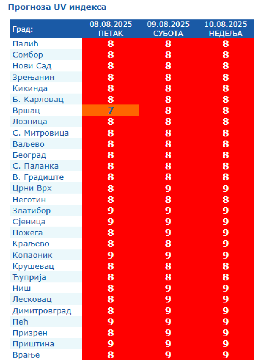 Vrednosti UV indeksa će i danas biti obeležene kao vrlo visoke u većem delu zemlje, te se preporučuje što manji boravak na otvorenom tokom jakih vrućina.
