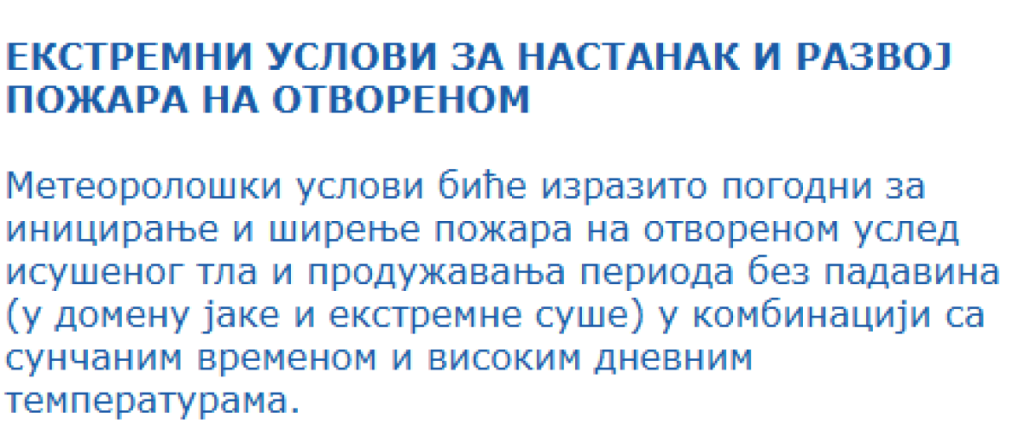 U upozorenju se navodi da će meteorološki uslovi biti izrazito pogodni za iniciranje i širenje požara na otvorenom usled isušenog tla i produžavanja perioda bez padavina (u domenu jake i ekstremne suše) u kombinaciji sa sunčanim vremenom i visokim dnevnim temperaturama.