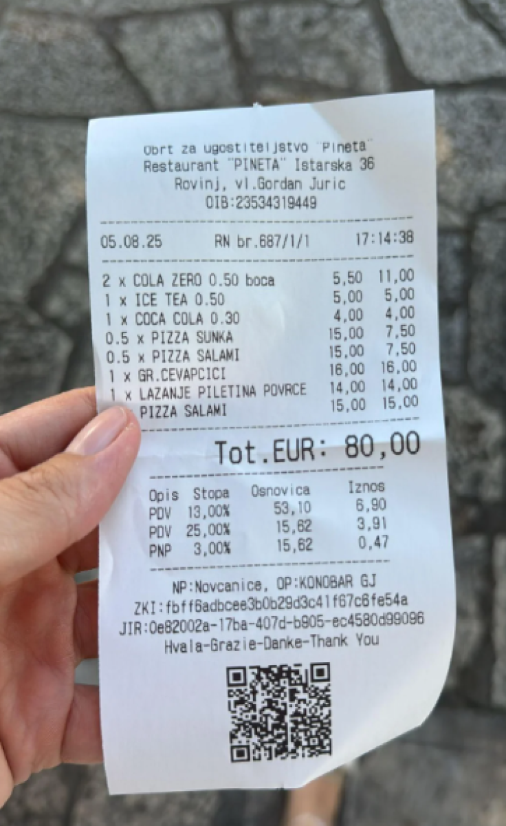 Ove sezone turisti koji letuju u Hrvatskoj iznova besne zbog visokih cena, pa je sada račun iz jednog restorana u Rovinju izazvao burne reakcije.