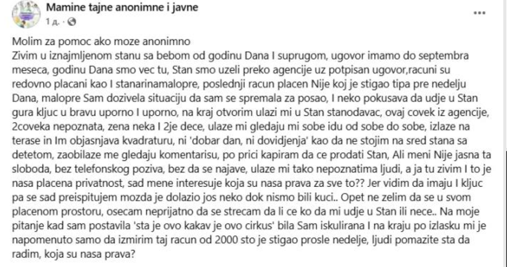 - Ušli su u stan, gledali su, išli iz sobe u sobu, na terasi, on im objašnjava kvadraturu, ni "dobar dan", ni "doviđenja" kao da ne stojim nasred stana sa bebom, zaobilaze me gledaju, komentarišu, po priči bih rekla da će prodati stan, ali meni nije jasna ta sloboda, bez telefonskog poziva, bez da se najave, ulaze sa nepoznatim ljudima, a ja tu živim i to je naša plaćena privatnost - napisala je ona.