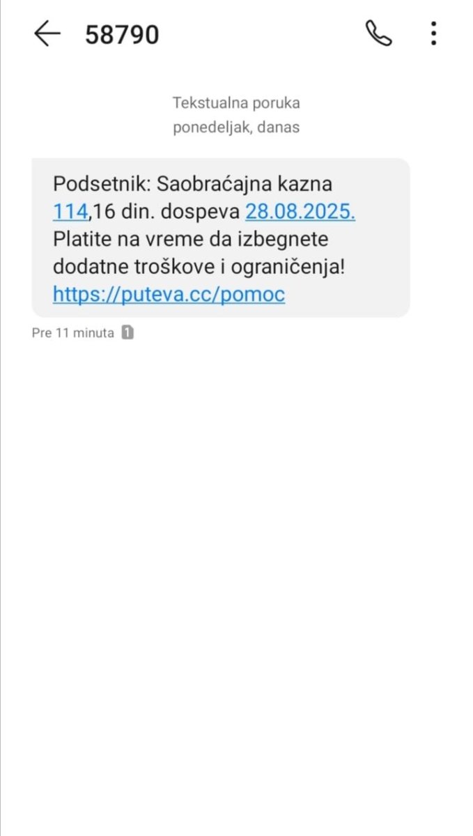 Nakon što su građanima Srbije masovno stizale poruke u kojima budu obavešteni o kazni koju nisu platili, prevaranti su nastavili sa prevarom tako što su promenili broj telefona, a u istu poruku dodali samo jednu reč kako bi prevara bila što uspešnija.