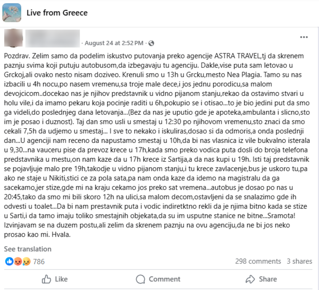 Naime, Slađan je svoje neprijatno iskustvo sa letovanja podelio na Fejsbuku, u grupi "Live from Greece", u kome je upozorio javnost da izbegavaju tu agenciju.