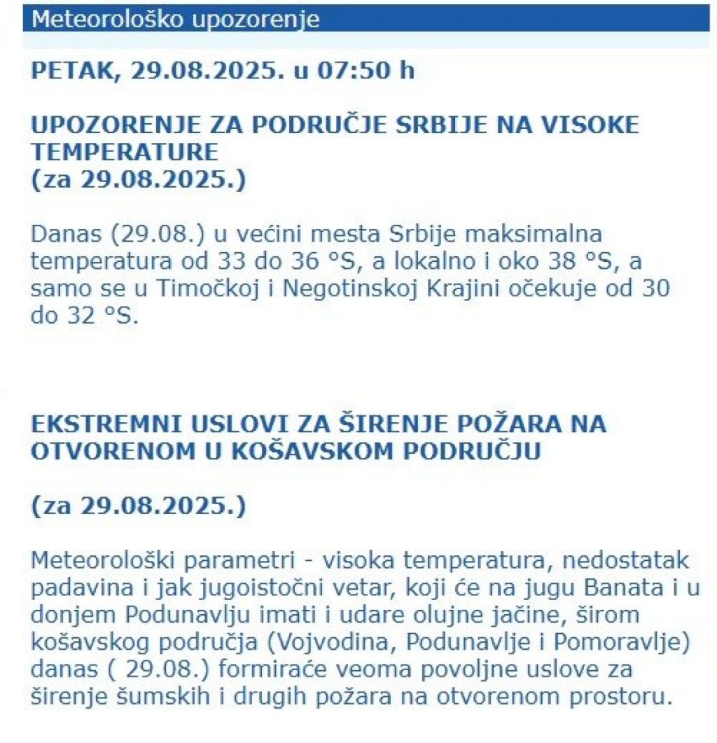 - Pored toga, jugoistočni vetar, koji će na jugu Banata i u donjem Podunavlјu imati i udare olujne jačine, širom košavskog područja (Vojvodina, Podunavlјe i Pomoravlјe) dans će formirati veoma povolјne uslove za širenje šumskih i drugih požara na otvorenom prostoru - upozoravaju oni.