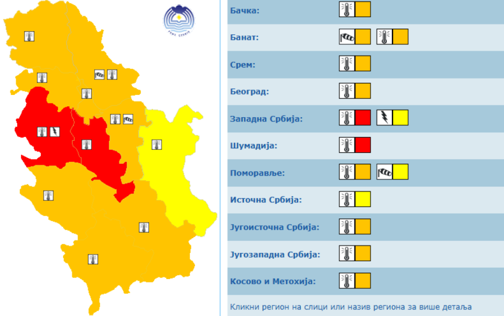 Crveni meteoalarm na snazi je u Šumadiji i Zapadnoj Srbiji zbog visokih temperatura.