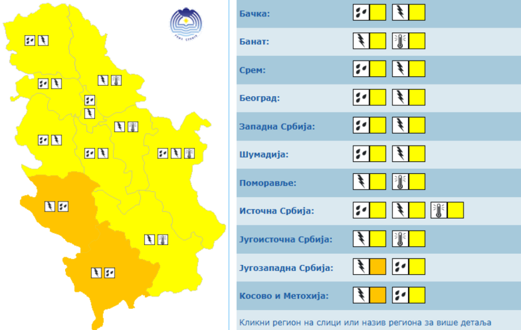 Žuti meteoalarmi na snazi su u Zapadnoj Srbiji zbog grmljavine, Pomoravlju zbog vetra i Istočnoj Srbiji zbog visokih temperatura.