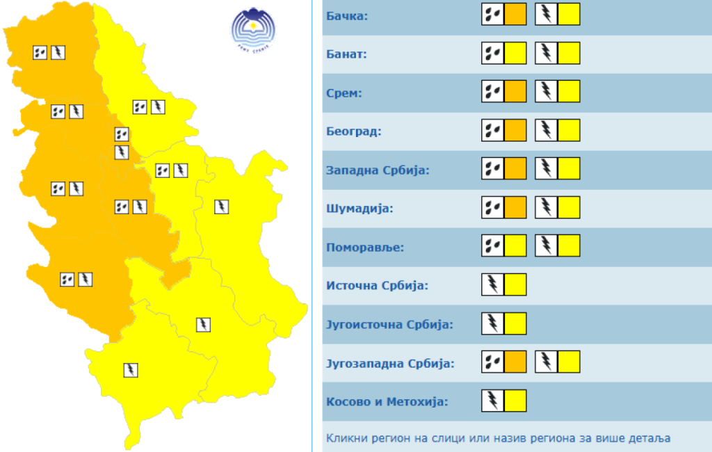 Republički hidrometeorološki zavod Srbije popalio je meteoalarme u većem delu zemlje.
