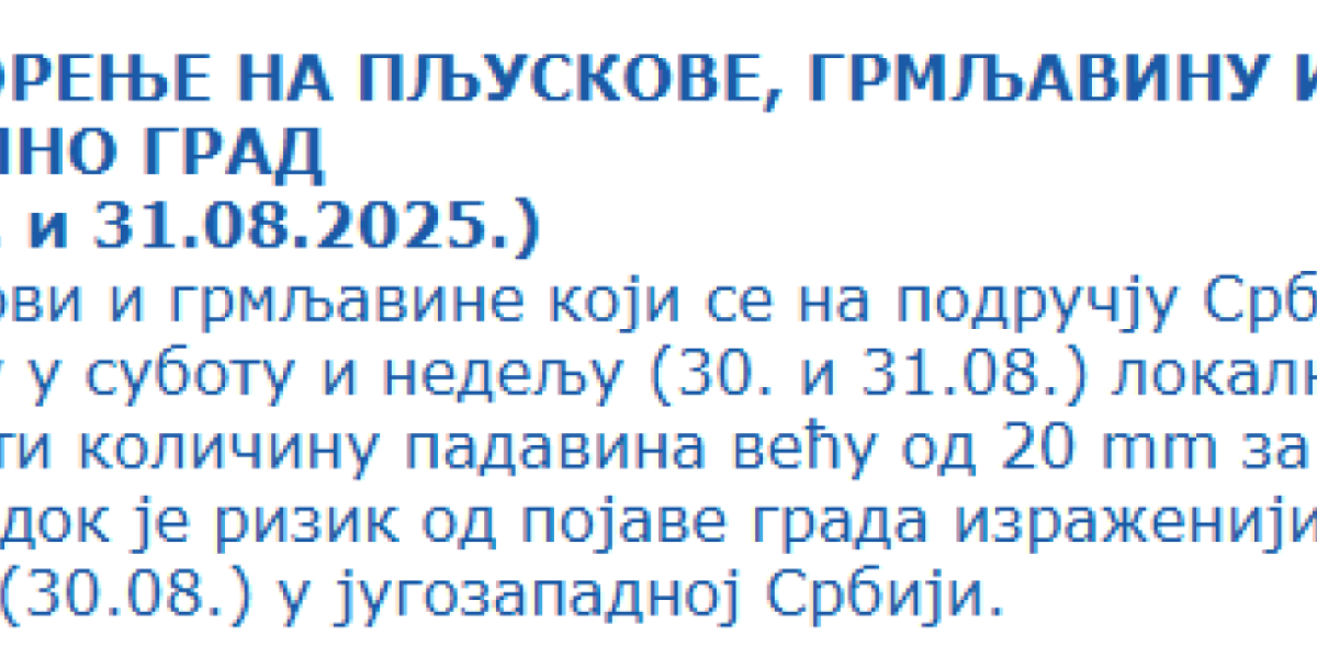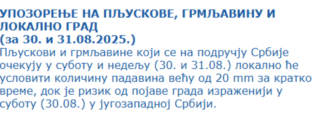 "Pljuskovi i grmljavine koji se na području Srbije očekuju u subotu i nedelju (30. i 31.08.) lokalno će usloviti količinu padavina veću od 20 milimetara za kratko vreme, dok je rizik od pojave grada izraženiji u subotu (30.08.) u jugozapadnoj Srbiji", navodi se u upozorenju.