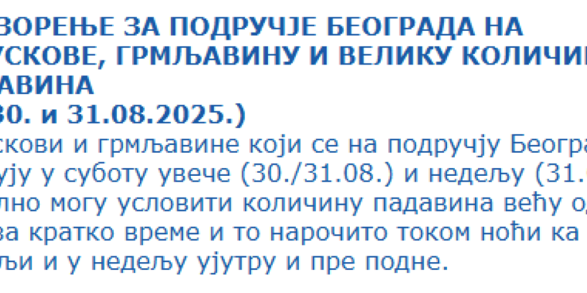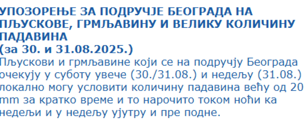 "Pljuskovi i grmljavine koji se na području Beograda očekuju u subotu uveče (30./31.08.) i nedelju (31.08.) lokalno mogu usloviti količinu padavina veću od 20 mm za kratko vreme i to naročito tokom noći ka nedelji i u nedelju ujutru i pre podne", upozorili su.
