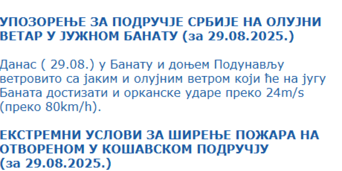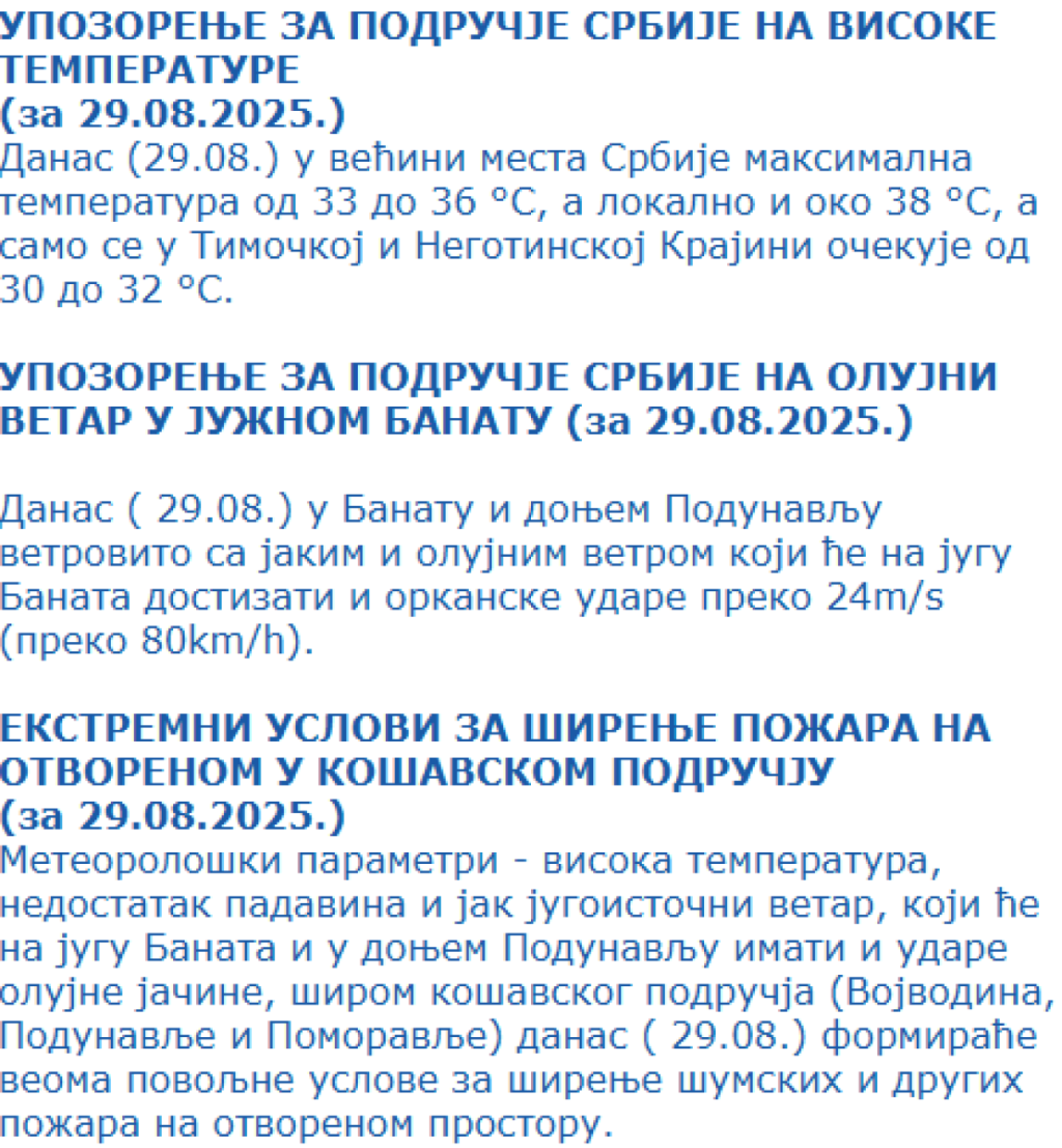 Za danas, 29. avgust, RHMZ je na sajtu izdao upozorenja na visoke temperature u većini delova zemlje, na olujni vetar na teritoriji Južnog Banata, kao i na ekstremne uslove za širenje požara na otvorenom u košavskom području.