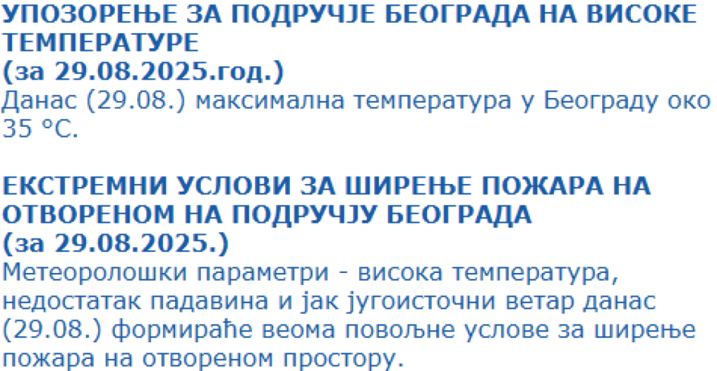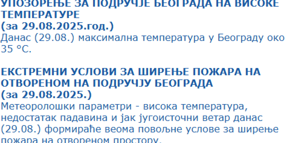 "Danas (29.08.) maksimalna temperatura u Beogradu oko 35 stepeni Celzijusovih. Meteorološki parametri - visoka temperatura, nedostatak padavina i jak jugoistočni vetar danas (29.08.) formiraće veoma povoljne uslove za širenje požara na otvorenom prostoru", naznačeno je.