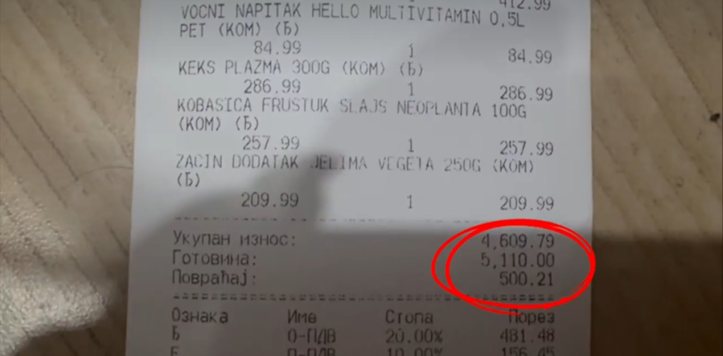 Među namirnicama koje je Lidija kupila, našli su se mleko, jogurt, plazma, sir, rezanci, pasirani paradajz i još mnoge druge stvari koje spadaju u prehrambrene proizvode, papirnu galanteriju i stvari za ličnu higijenu.