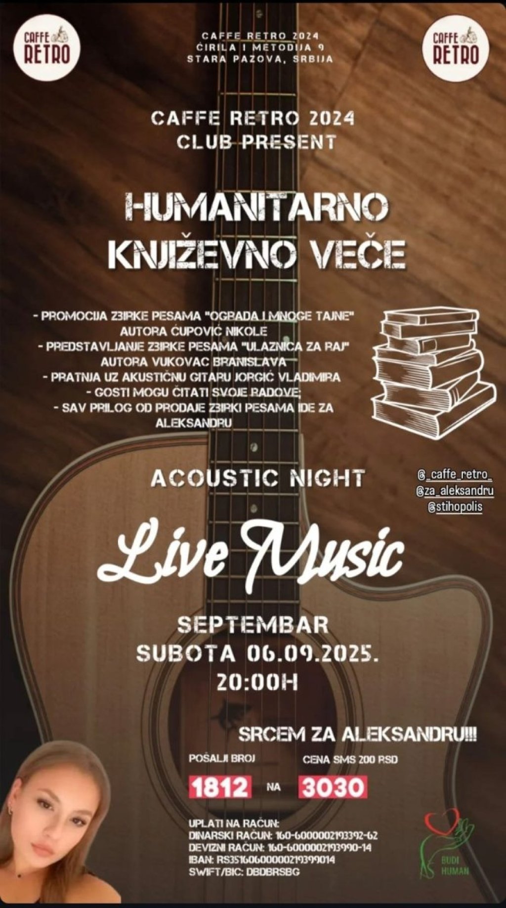 - Zamislili smo da promoviđemo zbirku pesama "Ograda i mnoge tajne" autora Ćupović Nikole, da predstavimo zbirku pesama "Ulaznica za raj" autora Vukovac Branislava. Sve to će biti praćeno uz akustičnu gitaru u izvođenju Jorgić Vladimira. Takođe, i gosti mogu čitati svoje radove, a cilj je da sav prilog od prodaje zbirki pesama ide za Aleksandru - ispričali su za Informer organizatori.