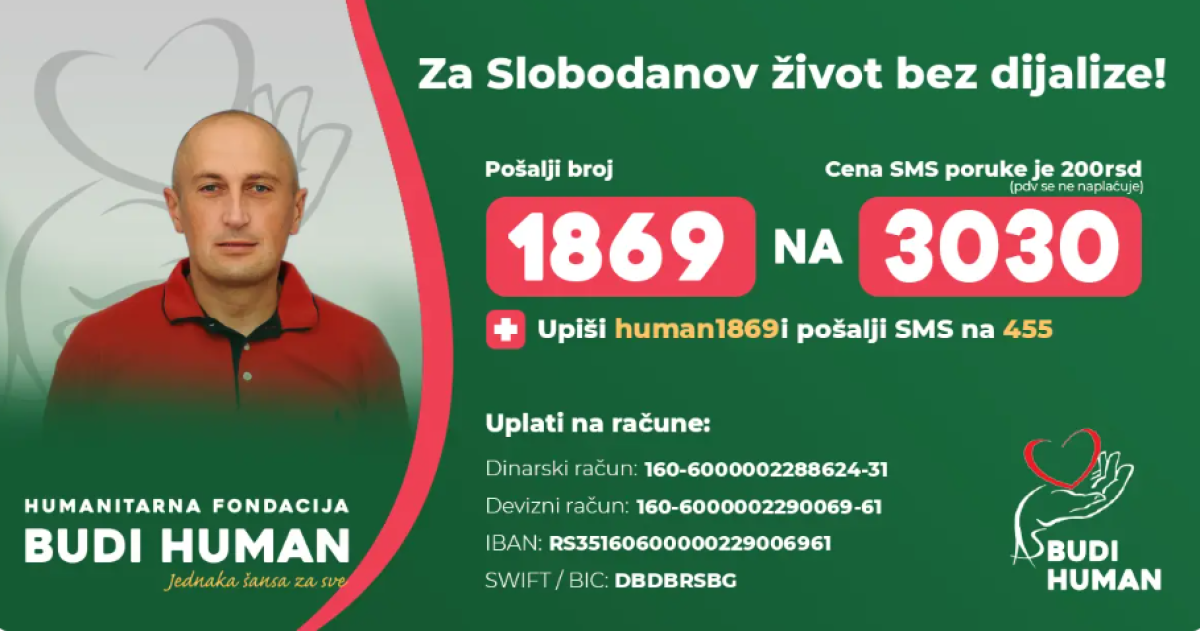 Slobodanu možete pomoći slanjem poruke sa brojem 1869 na broj 3030 ili uplatom na račune: