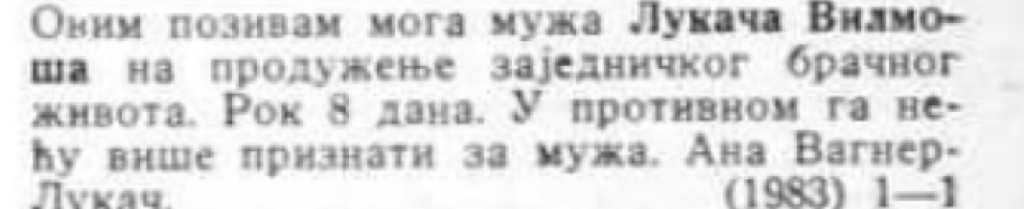 - Ovim pozivam moga muža Lukača Vilmoša na produženje zajedničkog bračnog života. Rok 8 dana. U protivnom ga neću više priznati za muža - pisalo je u oglasu potpisanom njenim imenom.