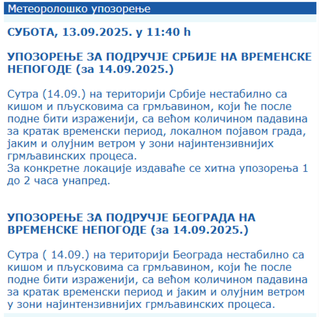 "Na teritoriji Srbije nestabilno sa kišom i pljuskovima sa grmljavinom, koji će posle podne biti izraženiji, sa većom količinom padavina za kratak vremenski period, lokalnom pojavom grada, jakim i olujnim vetrom u zoni najintenzivnijih grmljavinskih procesa. Za konkretne lokacije izdavaće se hitna upozorenja 1 do 2 časa unapred", navodi se u saopštenju RHMZ.