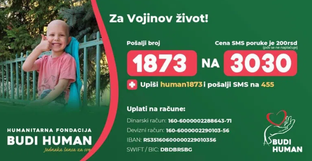 Petogodišnji Vojin Miloradović boluje od Akutne mijeloidne leukemije (AML) i trenutno se nalazi na lečenju u Univerzitetskoj dečijoj klinici u Tiršovoj. Za nastavak lečenja u inostranstvu potrebno je prikupiti novčana sredstva.