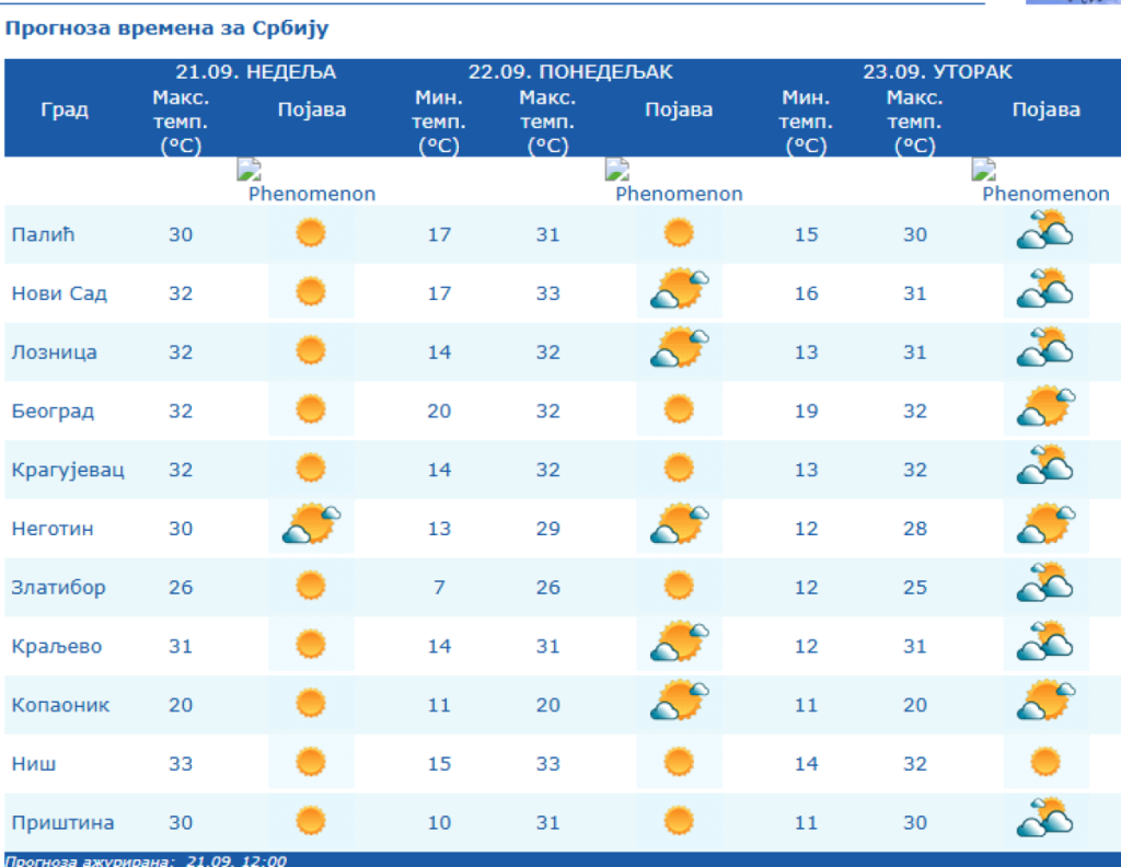 Prema izgledima vremena za narednih sedam dana (do ponedeljka, 29. septembra), u utorak (23. septembra) biće pretežno sunčano, jutro van košavskog područja prohladno, a tokom dana veoma toplo za poslednju dekadu septembra sa maksimalnom temperaturom od 29 do 33 stepena.