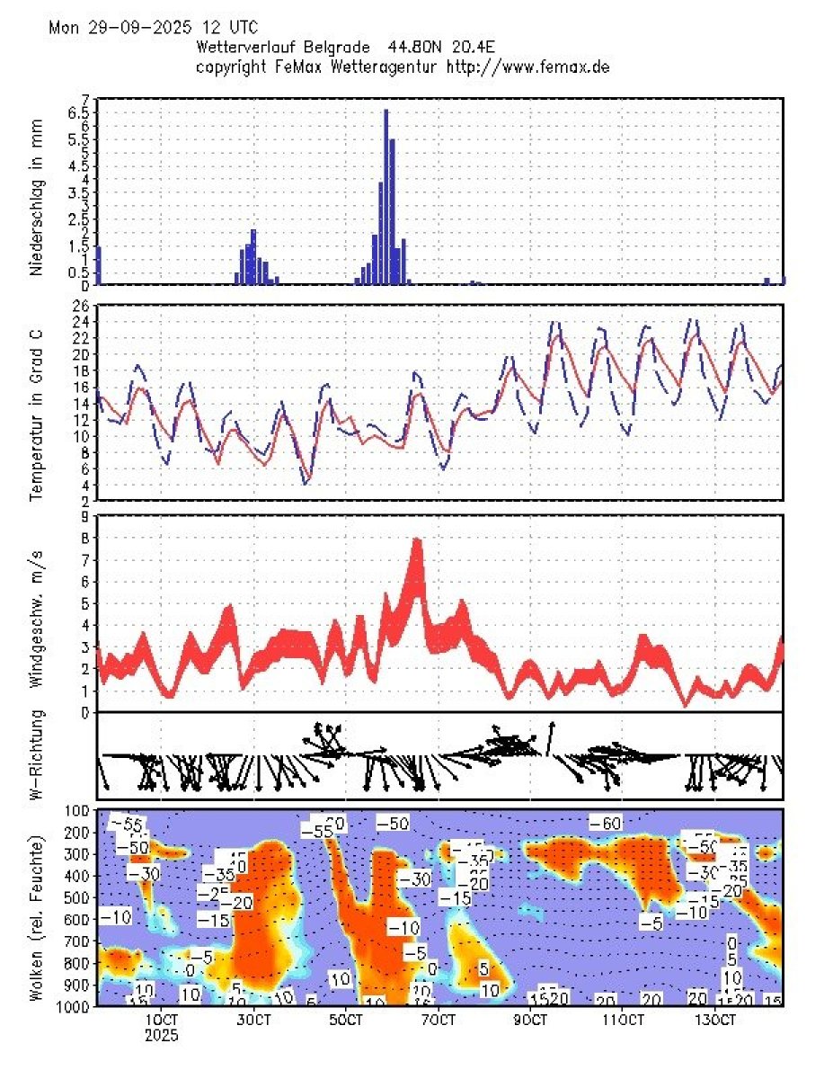 - U četvrtak, 2. oktobra, oblačnost će se polako premeštati na sever i do kraja dana i u toku naredne noći, između četvrtka i petka, padavina će stići do Sremske Mitrovice, Novog Sada i Kikinde. To će biti i granica padavina. Temperatura će u četvrtak u delovima gde ne bude padala kiša biti oko maksimalno 13-15 stepeni, a gde bude padavina 8-10 stepeni. Minimalne temperature će biti od 5 do 9 stepeni - istakao je meteorolog.