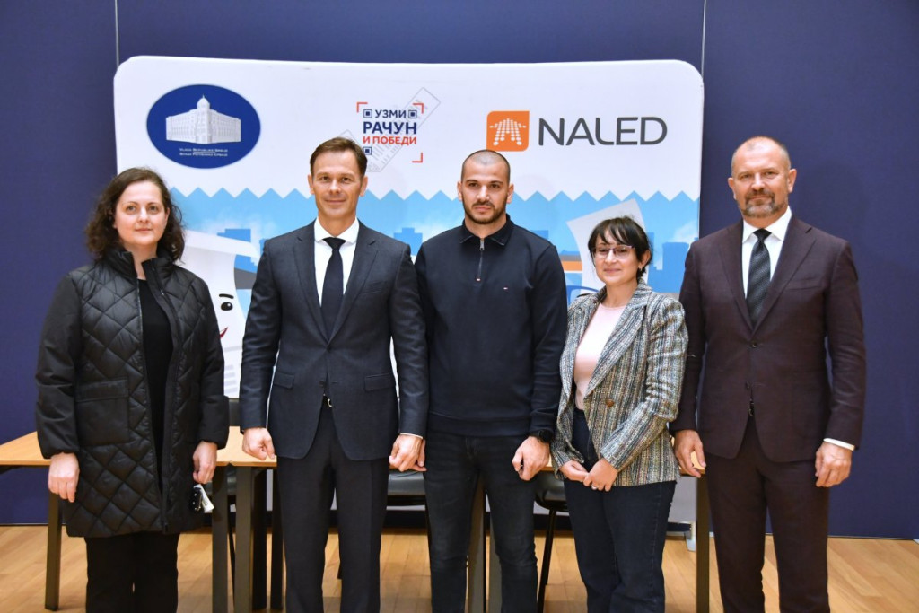 Prvi potpredsednik vlade i ministar finansija Siniša Mali i direktor Republičke direkcije za imovinu Jovan Vorkapić potpisali su ugovore sa dobitnicima nagradne igre "Uzmi račun i pobedi".