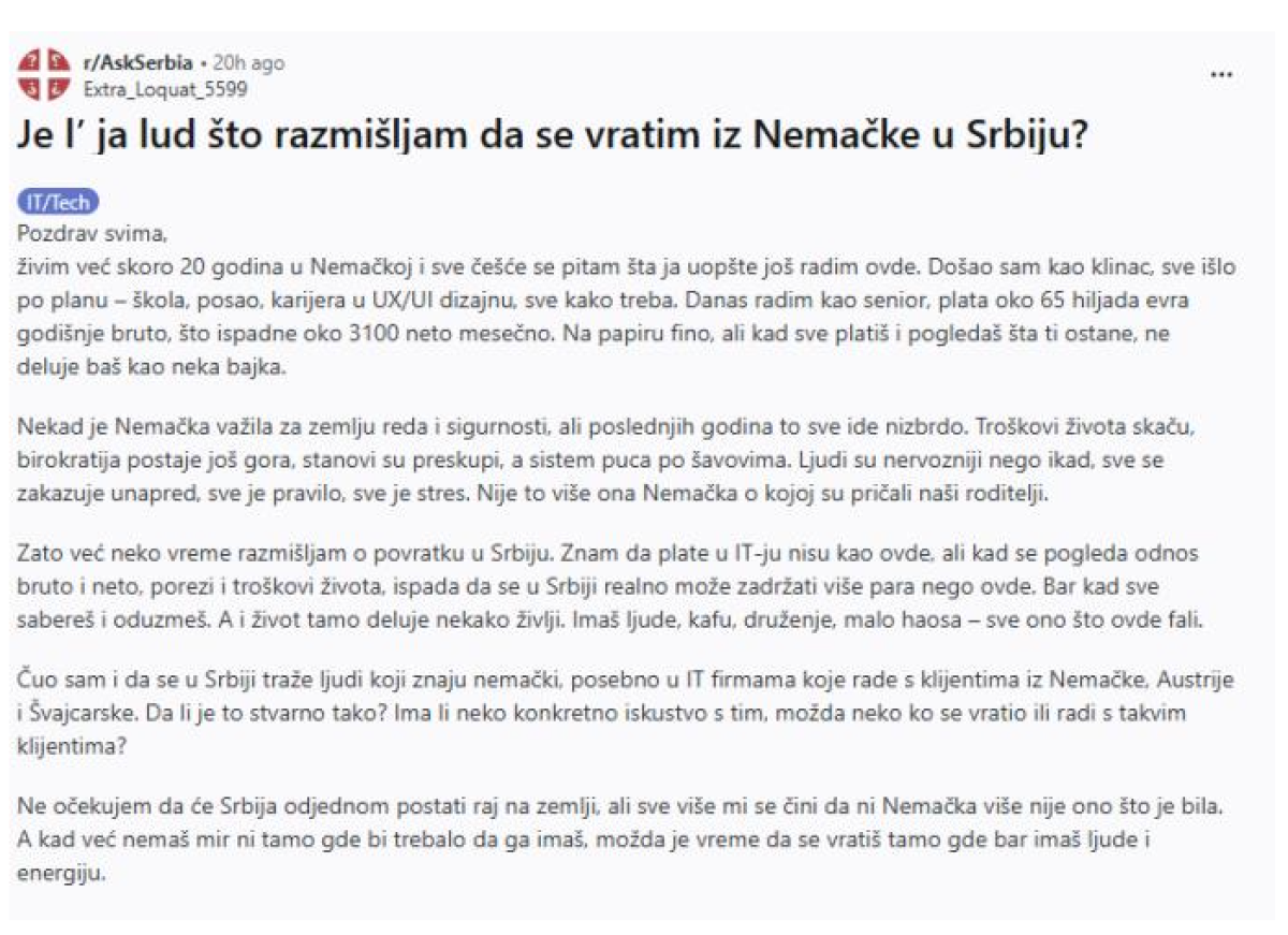 Naime, na društvenoj mreži Reddit osvanula je krajnje interesantna objava ovog Srbina koji je podelio svoje iskustvo sa ostalim korisnicima i naveo da se u Srbiji evidentno bolje živi nego u Nemačkoj.