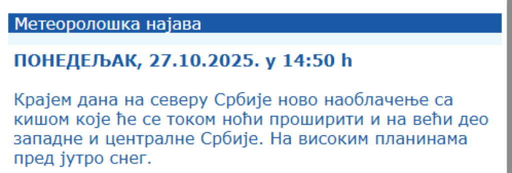 U utorak (28.10.) očekuje se i dalje prohladno vreme uz umeren, a u Vojvodini i istočnoj Srbiji povremeno i jak severozapadni vetar. Kiša se očekuje još ujutro i pre podne na jugu i jugoistoku Srbije, a na visokim planinama padaće sneg.