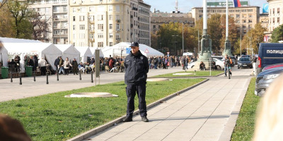 Ispred Doma Narodne skupštine nalazi se nekoliko policijskih službenika. Posle 11 dana štrajka glađu ispred Doma Narodne skupštine, poslanik Srpske napredne stranke (SNS) Uglješa Mrdić zbrinut je juče u Urgentnom centru, nakon što mu se pogoršalo zdravstveno stanje.