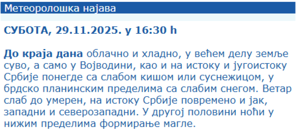 - Do kraja dana oblačno i hladno, u većem delu zemlje suvo, a samo u Vojvodini, kao i na istoku i jugoistoku Srbije ponegde sa slabom kišom ili susnežicom, u brdsko planinskim predelima sa slabim snegom. Vetar slab do umeren, na istoku Srbije povremeno i jak, zapadni i severozapadni. U drugoj polovini noći u nižim predelima formiranje magle - navodi se u upozorenju.