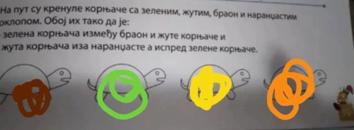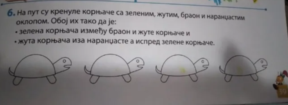 Na put su krenule kornjače sa zelenim, žutim, braon i narandžastim oklopom. Oboji ih tako da je: