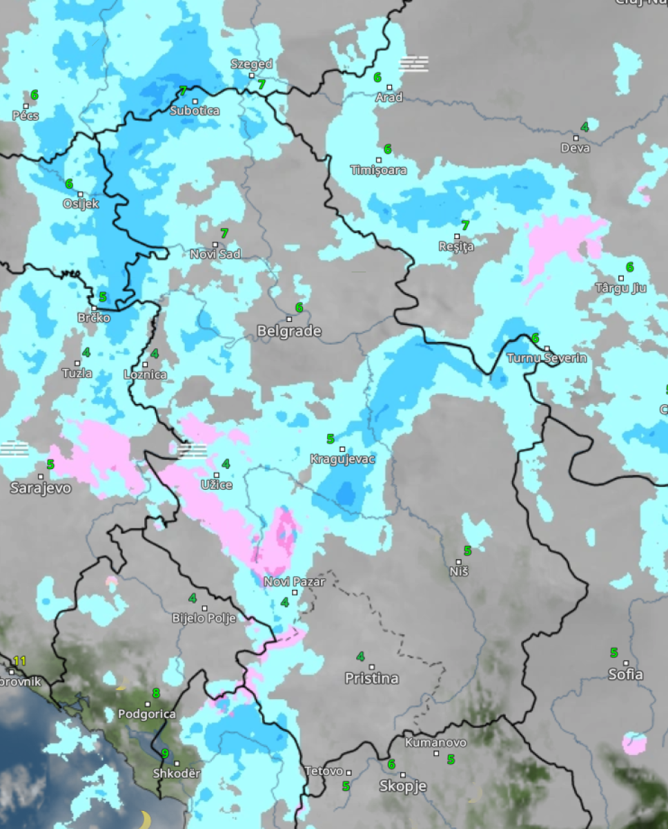 Vidljivost će značajno biti smanjena do kraja dana u brdsko-planinskim predelima južne i jugozapadne Srbije. U većem delu Srbije padaće kiša, dok se na višim planinama očekuje sneg.
