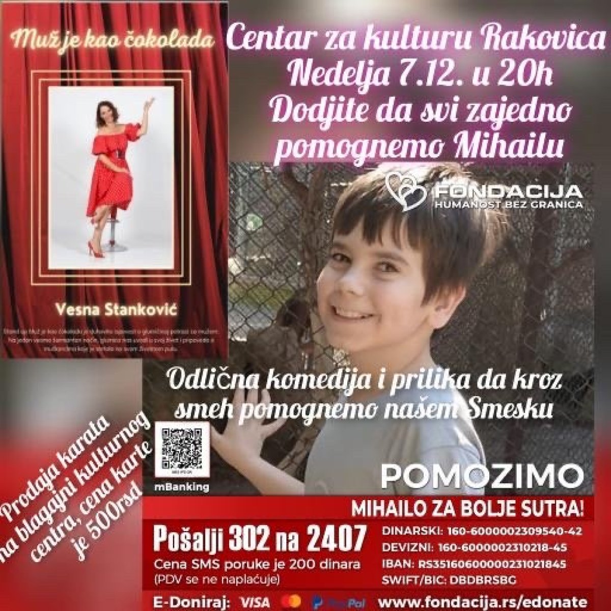 Večeras, 7. decembra u 20 časova, u Domu kulture Rakovica održaće se humanitarna predstava "Muž je kao čokolada", kako bi se prikupio novac za lečenje Mihaila Milojevića (10).
