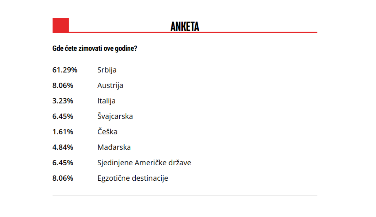 Naime, nedavno sprovedena Informerova anketa pokazala je fenomenalne rezultate! Na postavljeno pitanje: "Gde Srbi najviše zimuju?" čak 61.29 odsto naših čitalaca odgovorilo je sa: "Srbija".