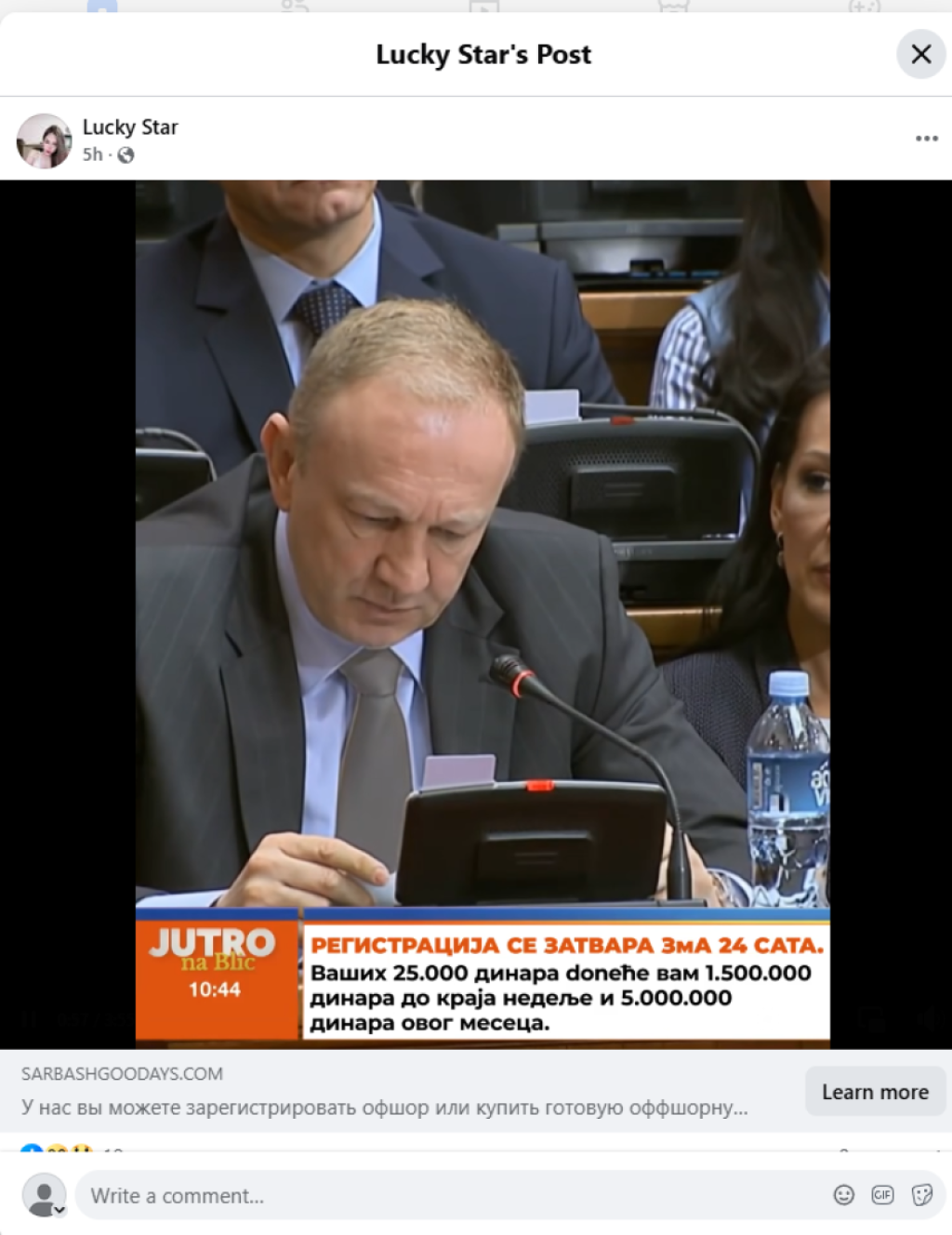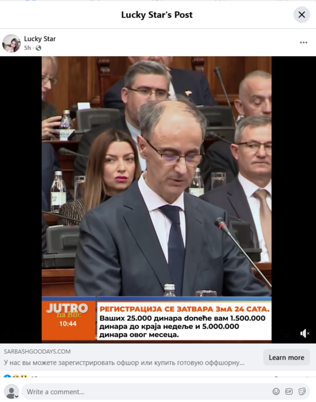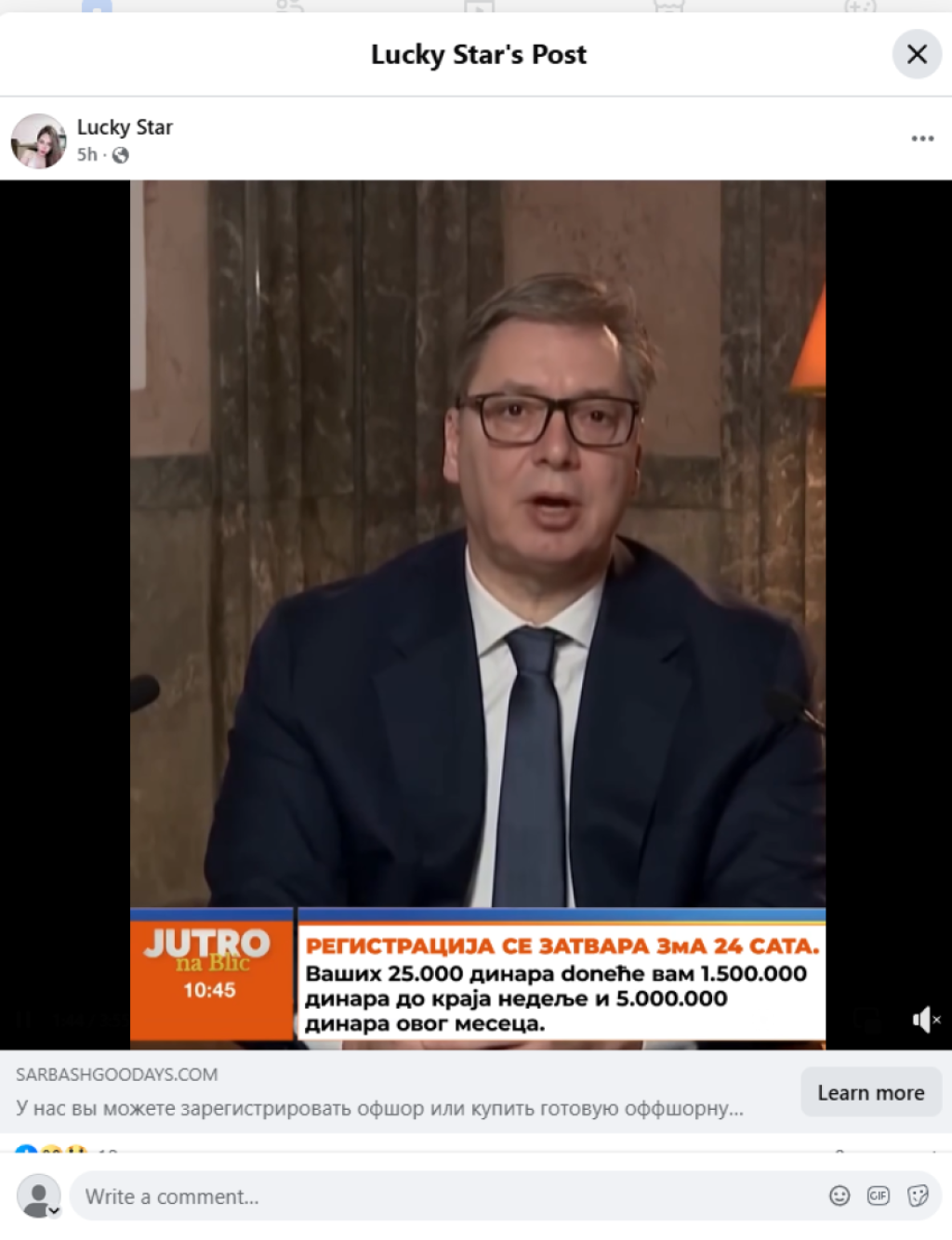 Naime, radi se o očiglednoj prevari koja je osvanula na Fejsbuk profilu "lucky star". Kada se klikne na objavu, lažan link sa ruskim natpisom vodi ka nepoznatom sajtu, a priložen je i video snimak sa nameštenim govorom predsednika Srbije Aleksandra Vučića, kao i premijera Đure Macuta.