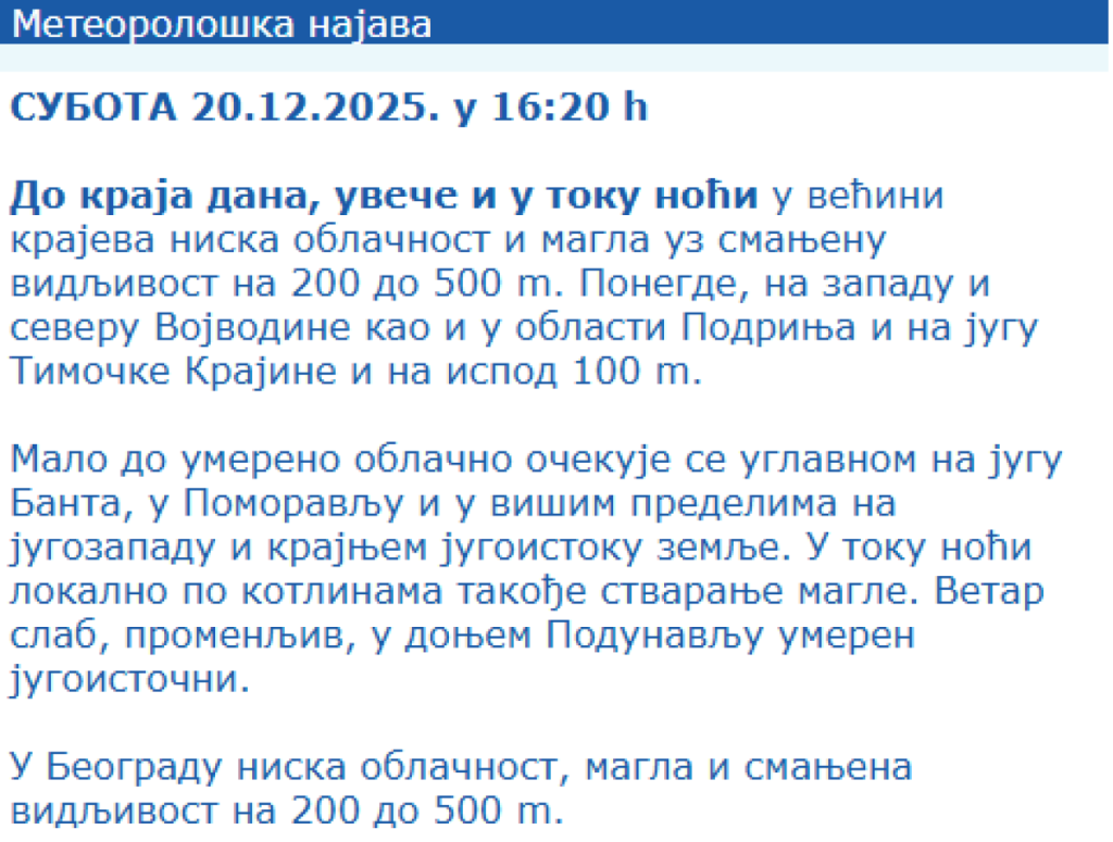 Danas se pre podne na zapadu Vojvodine, zapadu i istoku Srbije, kao i po kotlinama i dolinama reka očekuju magla i niska oblačnost, koja će se ponegde zadržati tokom celog dana.