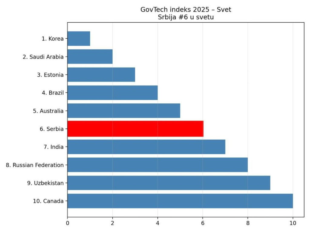 "Izašao novi GovTech Maturity Index - indeks tehnološke zrelosti javne uprave (GovTech Maturity Index – GTMI) koji se od 2020. godine objavljuje u istoimenom izveštaju Svetske banke, uz prateći set podataka. U ovogodišnjem izveštaju Srbija je dodatno napredovala i pozicionirana je na drugom mestu u Evropi i 6. u svetu. Ispred Srbije su Koreja, Saudijska Arabija, Estonija, Brazil i Australija! U prethodnom izveštaju 2022. godine, Srbija je prema vrednosti GTMI indeksa bila pozicionirana na 4. mestu u Evropi i 11. na svetu", napisala je Ana na svom Instagram profilu.