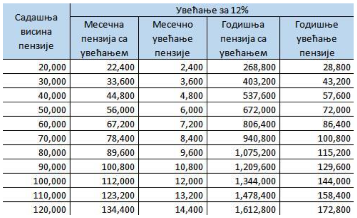 Na visinu penzije pre povećanja, koja iznosi 20.000 dinara, povećanje od 12 odsto iznosi 2.400 dinara, što znači da će penzija sa povećanjem u sklopu novih mera države iznositi 22.400 dinara - a uvećanje na godišnjem nivou će iznositi 28.800 dinara.