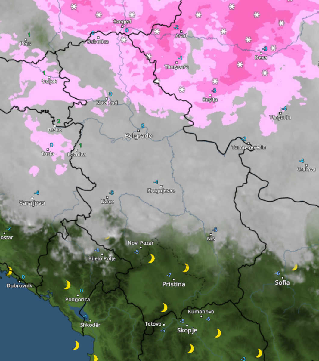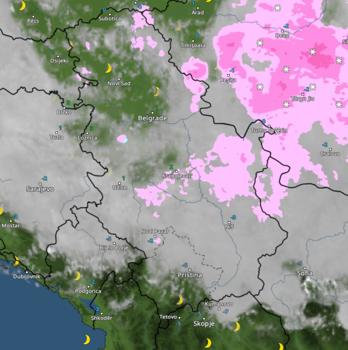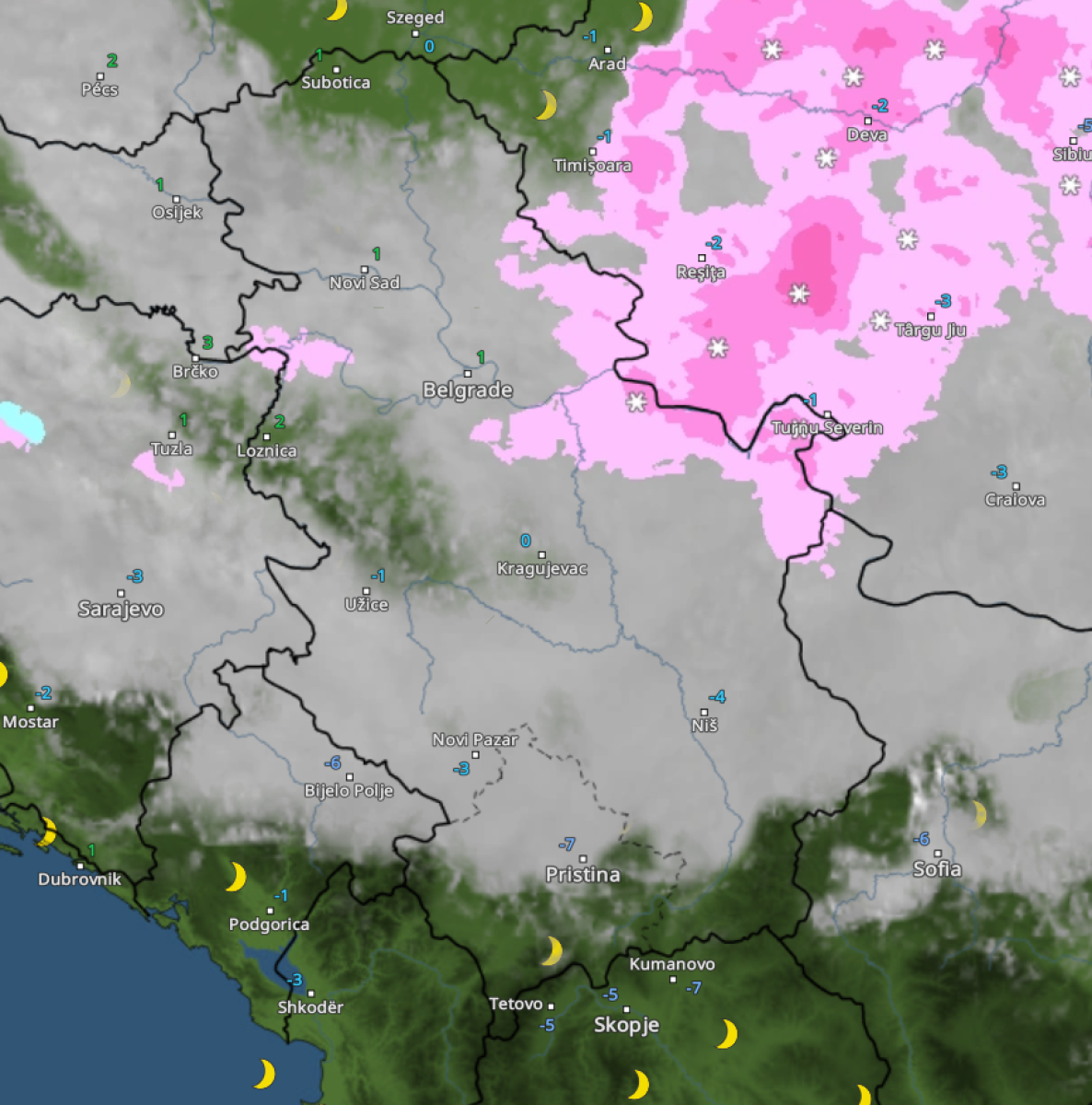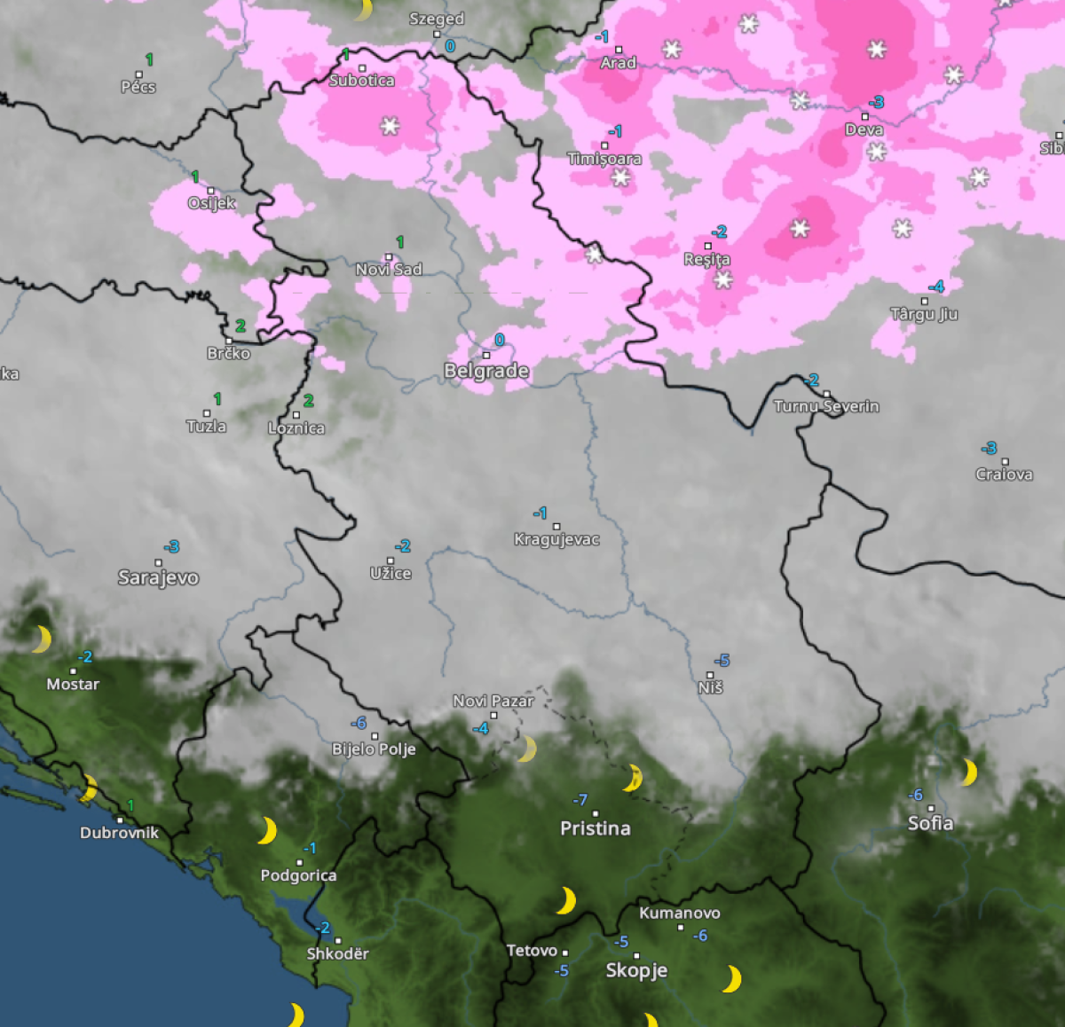 Tokom dana sneg će zahvatiti severne delove naše zemlje, dok će se u popodnevnim časovima premestiti ka istoku, a u ponoć će zahvatiti istočne i centralne delove Srbije.