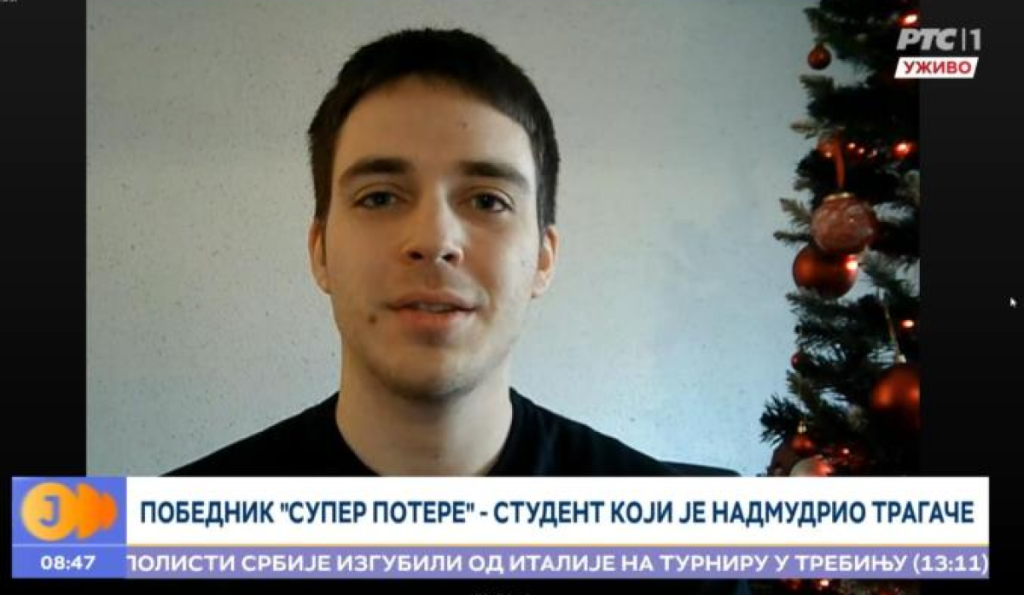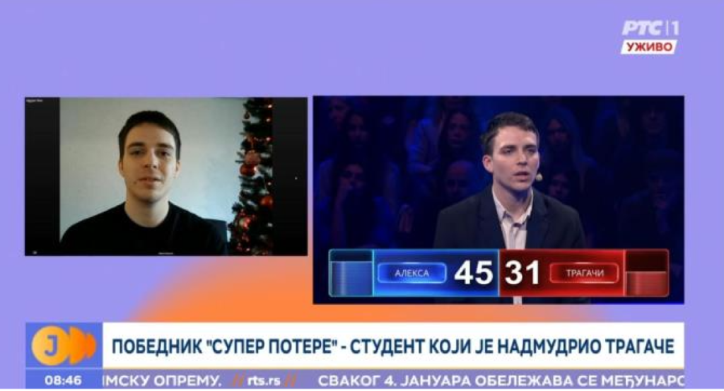 Aleksa Stefanović iz Pirota pobedio je Tragače u kvizu "Super potera" i osvojio 2.000.000 dinara, a tim povodom gostovao je i na RTS-u.