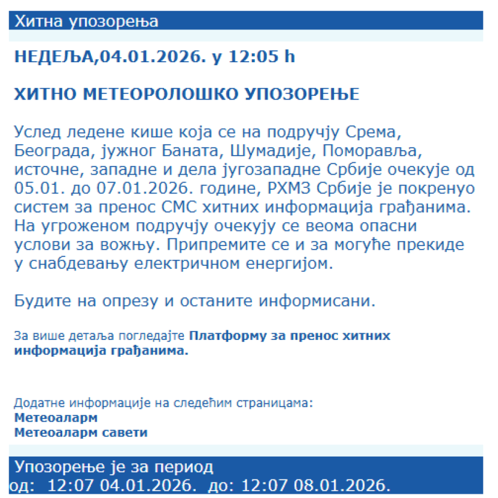 Zbog snega koji je napadao u gotovo čitavoj Srbiji, oglasio se i RHMZ i takođe izdao hitno upozorenje na ledenu kišu.