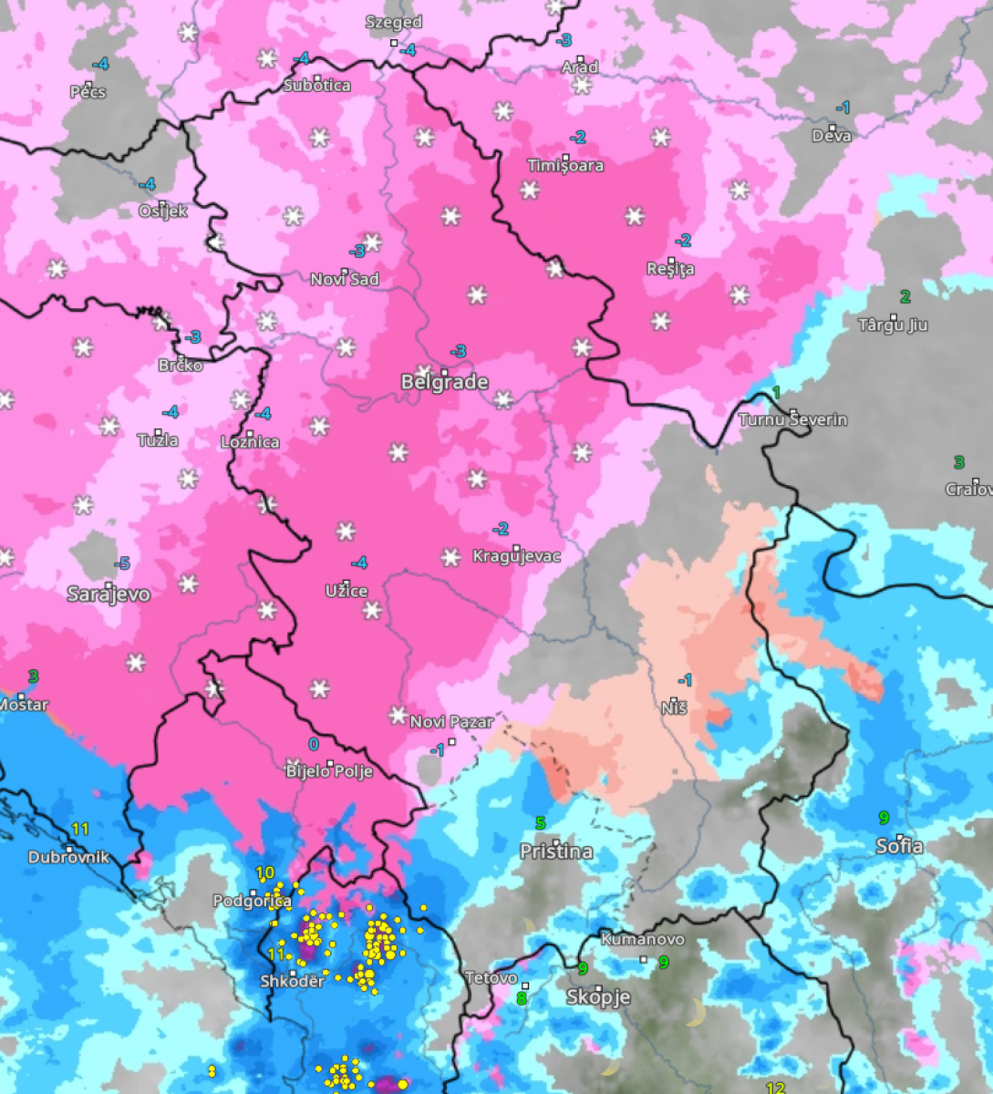 Ove večeri u većem delu Srbije veje sneg. Sneg pada i u Beogradu. U centralnim i jugoistočnim predelima Srbije pada ledena kiša i stvara se veoma opasna poledica.