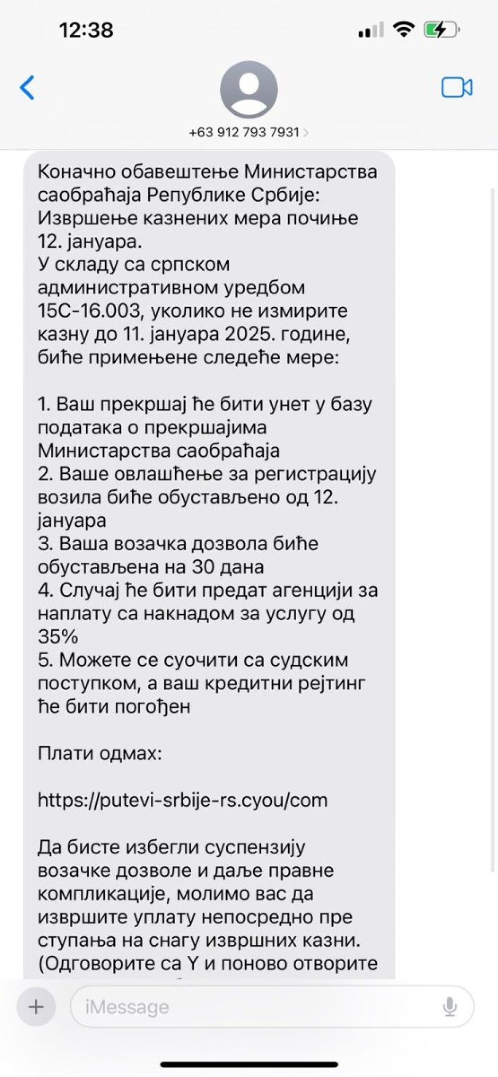 - U skladu sa srpskom administrativnom uredbom 15C-16.003, ukoliko ne izmirite kaznu do 11. jamuara 2025. godine, biće primenjen sledeće mete: Vaš prekršaj će biti unet u bazu podataka o prekršajima, Vaše ovlašćenje za registracijіu vozila biće obustavljen 12. januara. Vaša vozačka dozvola biće obustavljena na 30 dana.... Možete se suočiti sa sudskim postupkom, a vaš kreditni rejting će biti pogođen - između ostalog piše u sms prevari.