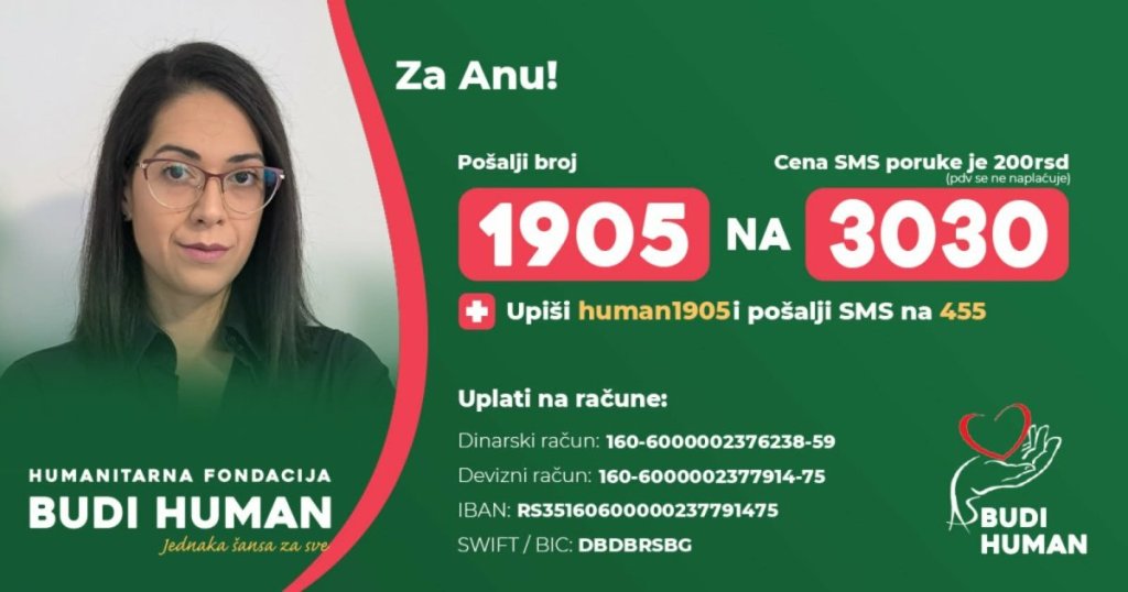 Podaci za donacije dostupni su preko fondacije "Budi Human", a svaka podrška približava Anu cilju - životu bez bolesti.