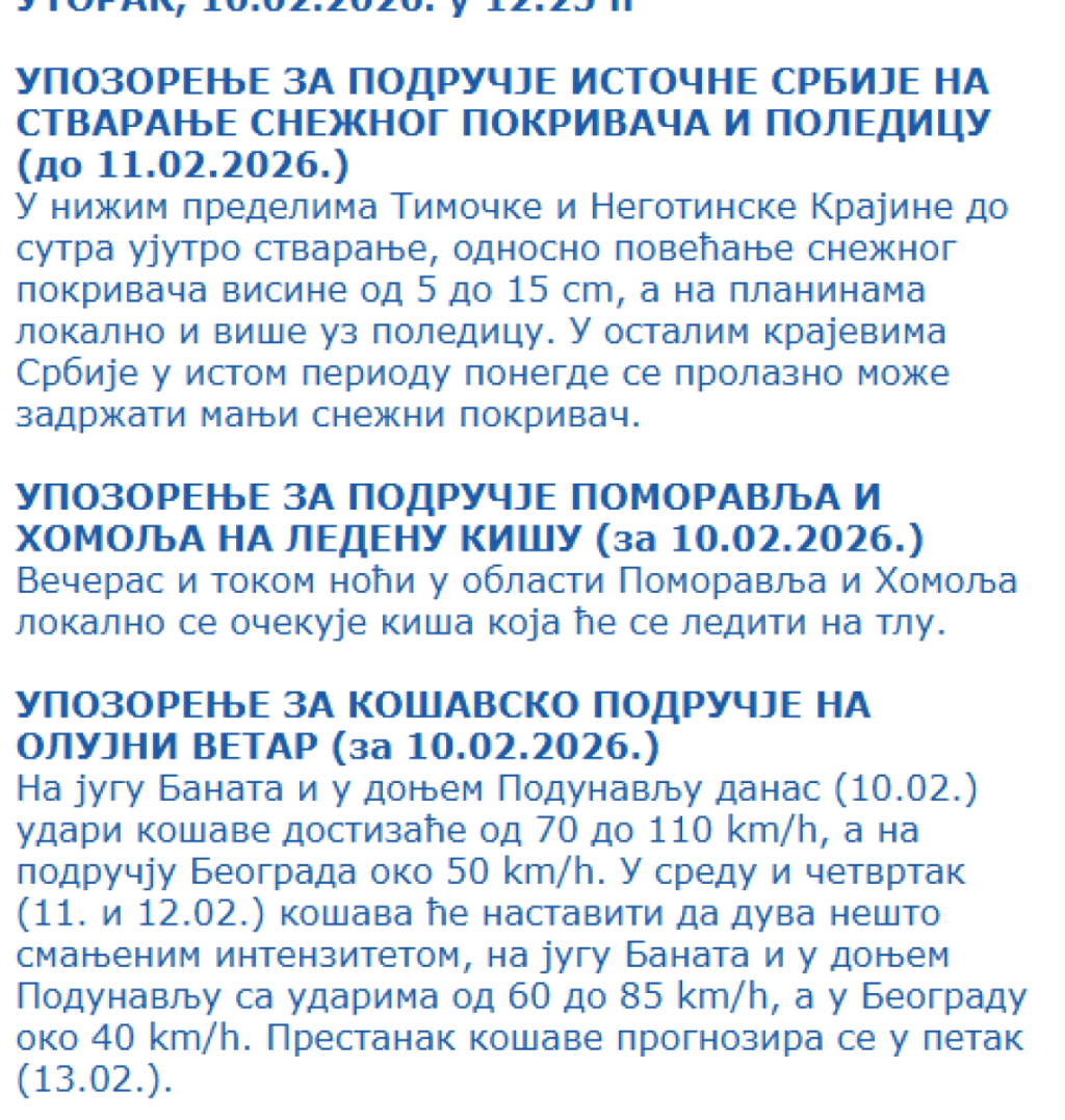Kako su naveli, upozorenje važi za područje istočne Srbije na stvaranje snežnog pokrivača i poledicu, područje pomoravlja i homolja na ledenu kišu, kao i košavsko područje na olujni vetar.