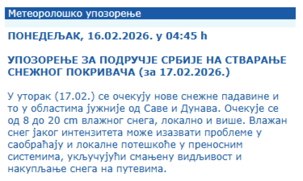 - Vlažan sneg jakog intenziteta može izazvati probleme u saobraćaju i lokalne poteškoće u prenosnim sistemima, uključujući smanjenu vidljivost i nakupljanje snega na putevima - navodi se u saopštenju RHMZ.