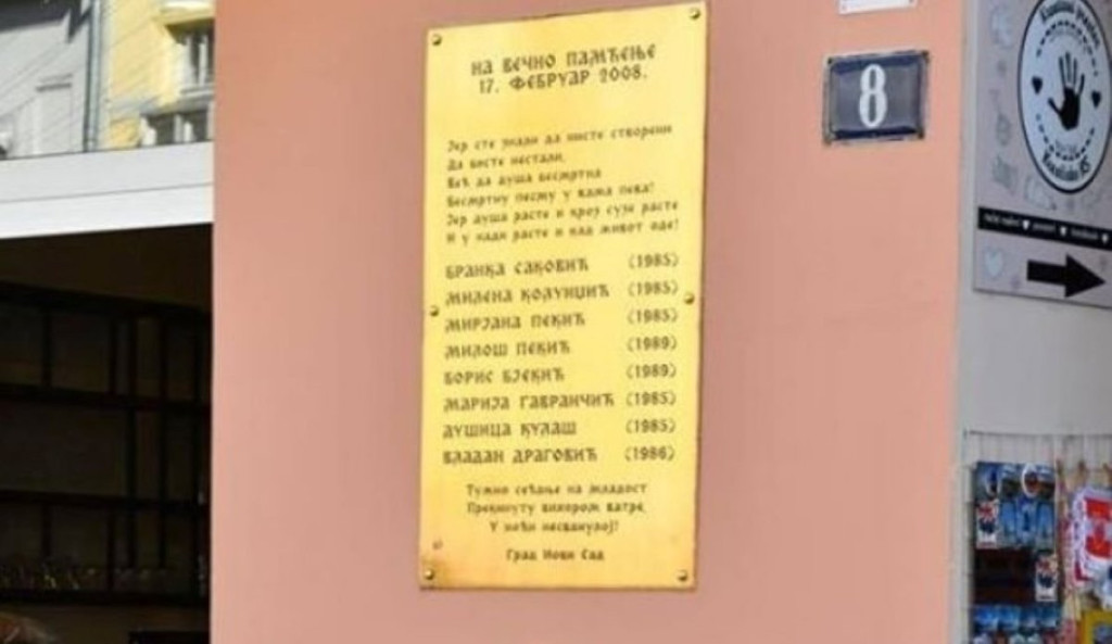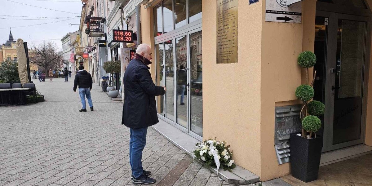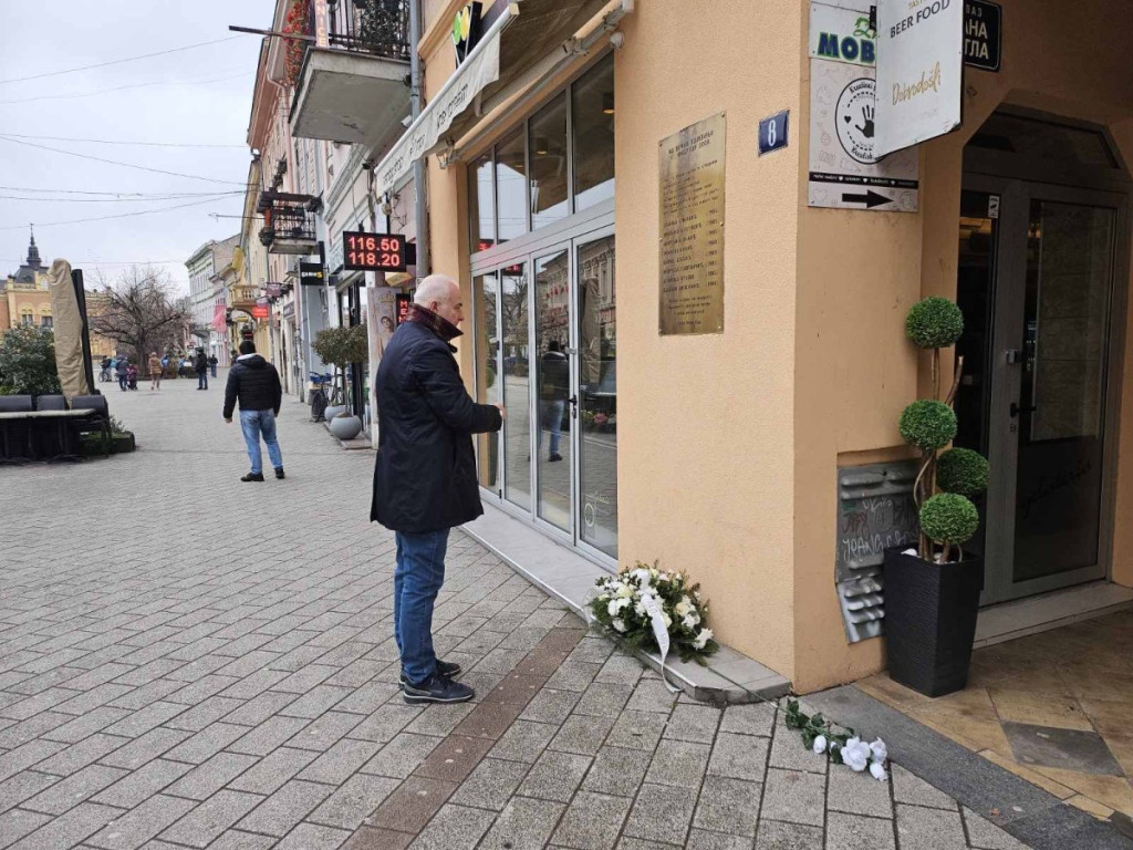 Članovi porodica i prijatelji nastradalih u požaru u kafiću "Laundž”, 17. februara 2008. i pomoćnik gradonačelnika Novog Sada Aleksandar Petrović položili su cveće ispred