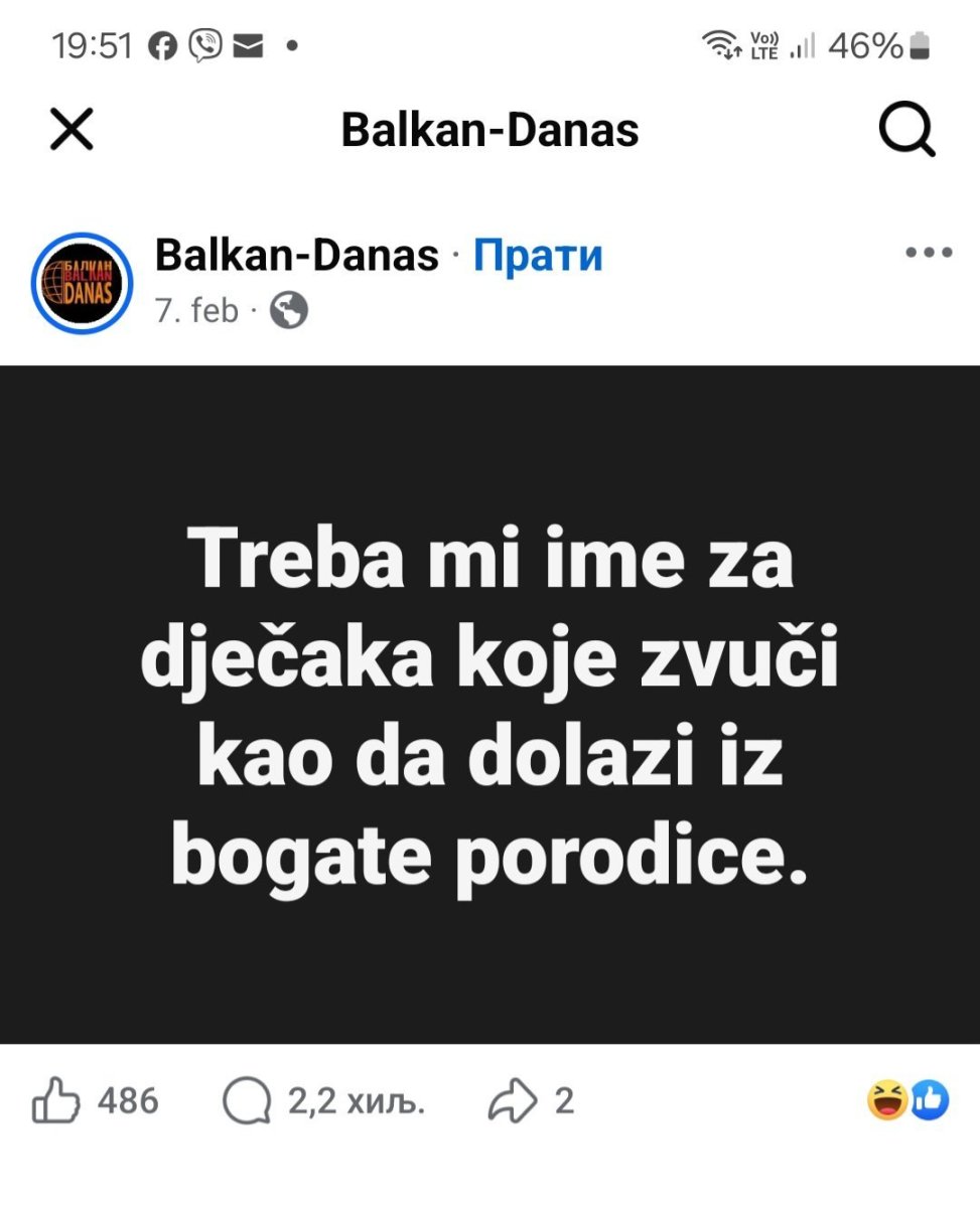 Pitanje na Fejsbuk stranici "Balkan-Danas", međutim, pokrenulo je čitavu lavinu komentara, a glasi: Treba mi ime za dječaka koje zvuči kao da dolazi iz bogate porodice".
