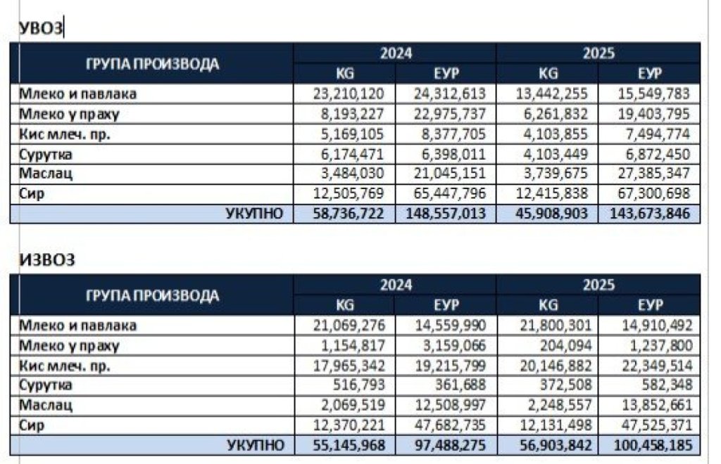 Srbija je u 2025. godini imala veći izvoz nego uvoz mleka i mlečnih proizvoda, pokazuju zvanični podaci Ministarstva poljoprivrede. To jasno pokazuje da poljoprivrednici zgubidani šire laži i ubeđuju narod da svoje mleko prosipaju, jer se masovno uvozi.