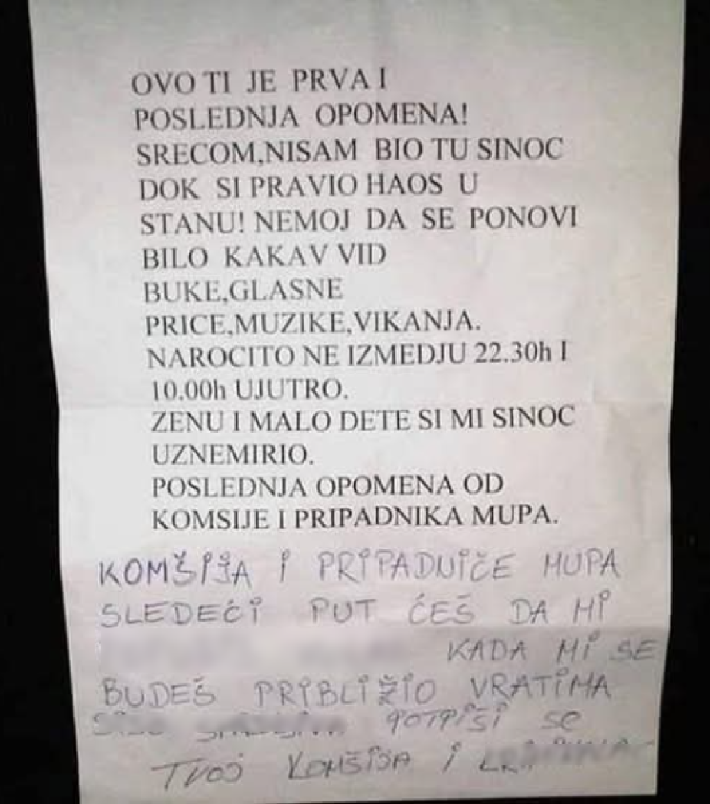 "Ovo ti je prva i poslednja opomena! Srećom, nisam bio tu sinoć dok si pravio haos u stanu! Nemoj da se ponovi bilo kakav vid buke, glasne priče, muzike, vikanja. Naročito ne oko 22.30 časova i 10 sati ujutru. Ženu i malo dete si mi sinoć uznemirio. Poslednja opomena od komšije i pripadnika MUP-a", napisao je ljut komšija, nakon čega je pismeni odgovor od komšije koji danima pravi buku, dobio u nastavku.