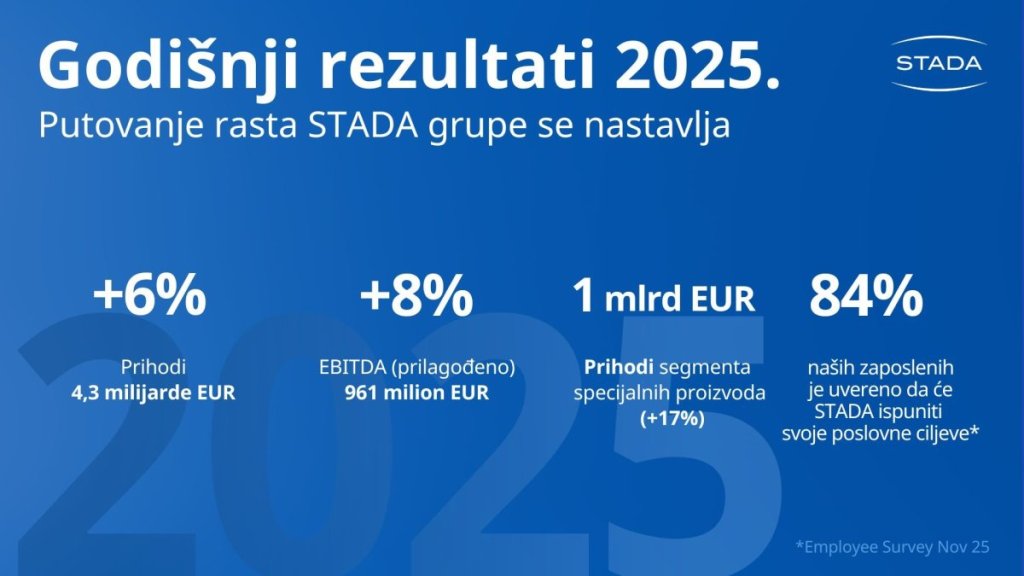 Segment specijaliteta premašio milijardu evra: Prihodi segmenta specijaliteta, vođeni biosimilarima i inovativnim lekovima, po prvi put u 2025. premašili su milijardu evra, uz rast od 17 odsto i sada čine gotovo jednu četvrtinu ukupnih prihoda Grupe. Među ključnim pokretačima izdvaja se i kontinuirani rast postojećeg portfolija biosimilara u širokom spektru terapeutskih oblasti poput zdravlja kostiju, imunologije i onkologije. Ove godine planirano je lansiranje pet novih biosimilara, čime STADA grupa dodatno jača svoju poziciju lidera u Evropi.