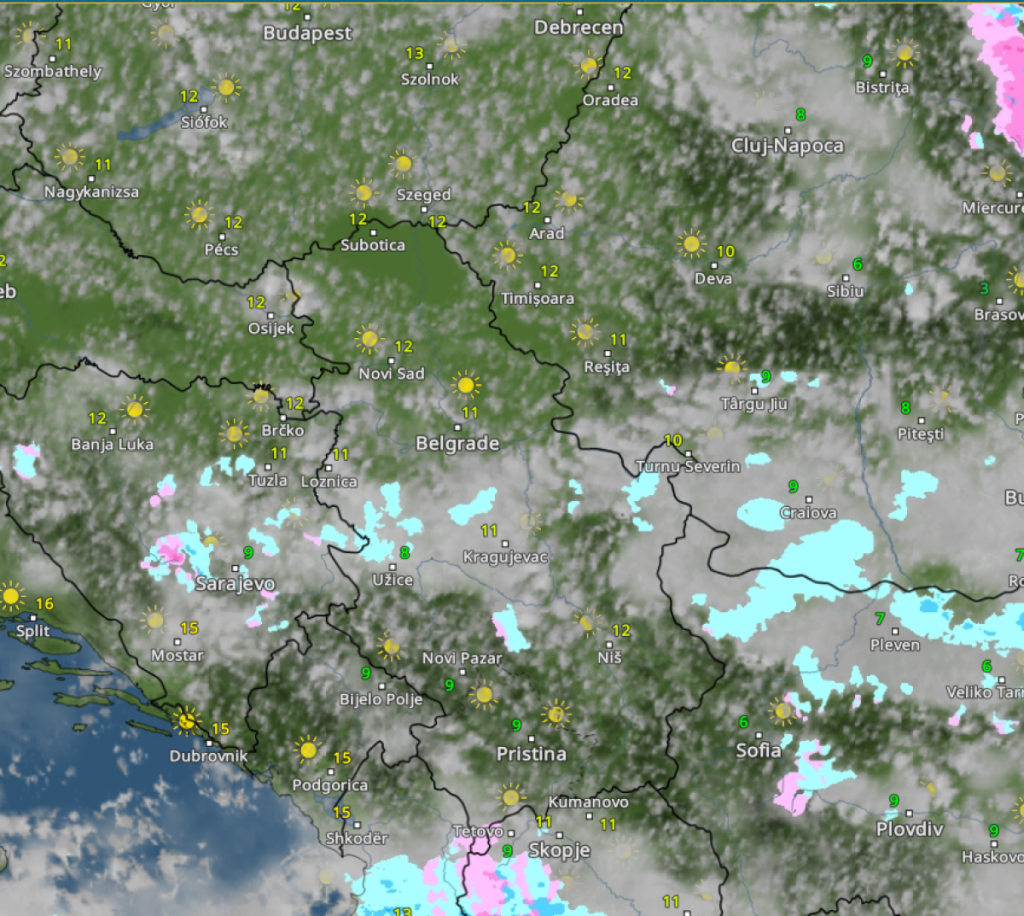 Republički hidrometeorološki zavod (RHMZ) saopštio je da se u toku noći očekuje jače naoblačenje sa zapada, koje će mestimično usloviti kišu, a u višim planinskim predelima jugozapadne i južne Srbije i sneg.