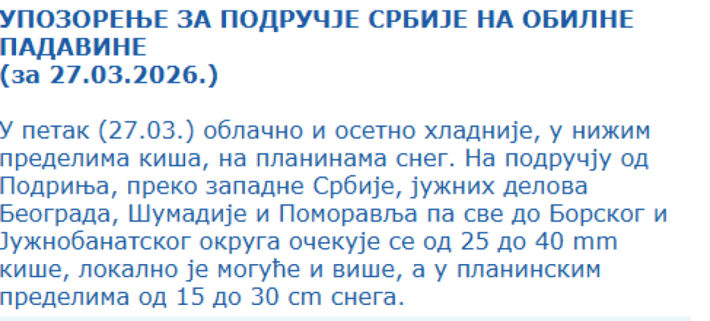 "U petak oblačno i osetno hladnije, u nižim predelima kiša, na planinama sneg. Na području od Podrinja, preko zapadne Srbije, južnih delova Beograda, Šumadije i Pomoravlja pa sve do Borskog i Južnobanatskog okruga očekuje se od 25 do 40 mm kiše, lokalno je moguće i više, a u planinskim predelima od 15 do 30 cm snega", navodi RHMZ.
